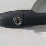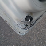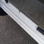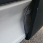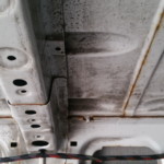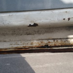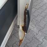 - And an inspection of all doors confirms the first impression: EVERY door COMPLETELY rusted out. The side door already at the rear external edge halfway up as well. Someone – at some point – attempted something similar to a repair of the rear doors, and failed.